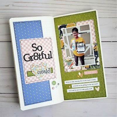 Supplies Used: Patterned Paper: Pebbles (Jen Hadfield) Reaching Out, Pebbles (Jen Hadfield) Along the Way & Paige Taylor Evans Wonders (green); stickers: Simple Stories Hey Crafty Girl (word strip & word "create"), Carta Bella Craft & Create and Pebbles (Jen Hadfield) Reaching Out (hearts); Letter Stickers: Keeping Cozy by the Hip Kit Club; enamel dots: My Mind's Eye, white pen: Signo; black pen: Sharpie